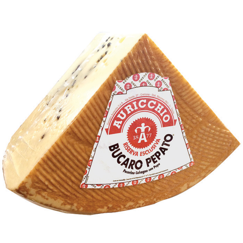 Pecorino Calcagno Pepato is a handmade cheese made from pasteurized sheep's milk and dotted with peppercorns from local farms on the island of Sardinia. Adding black peppercorns give the cheese a distinctive and spicy flavour.