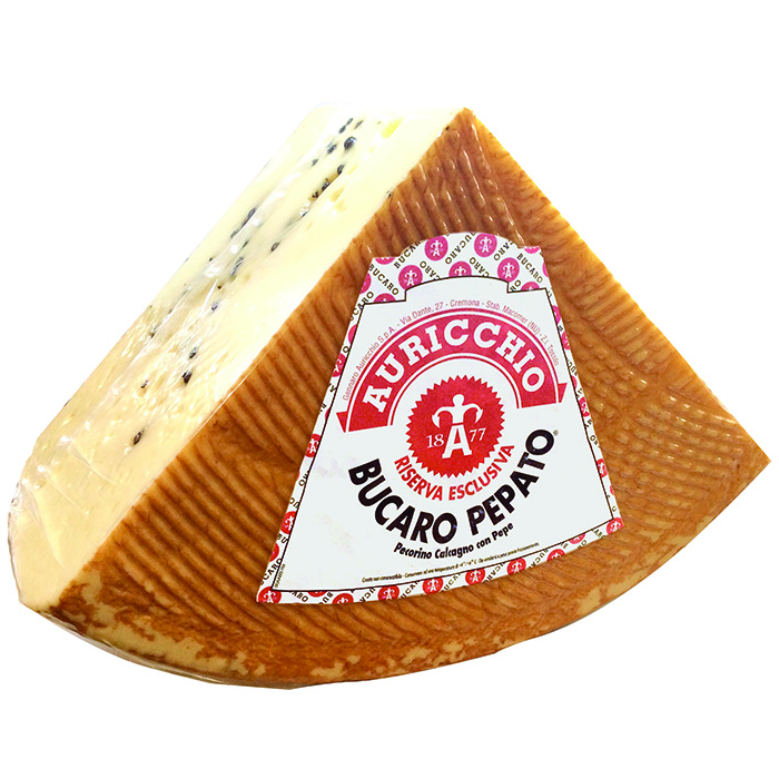 Pecorino Calcagno Pepato is a handmade cheese made from pasteurized sheep's milk and dotted with peppercorns from local farms on the island of Sardinia. Adding black peppercorns give the cheese a distinctive and spicy flavour.