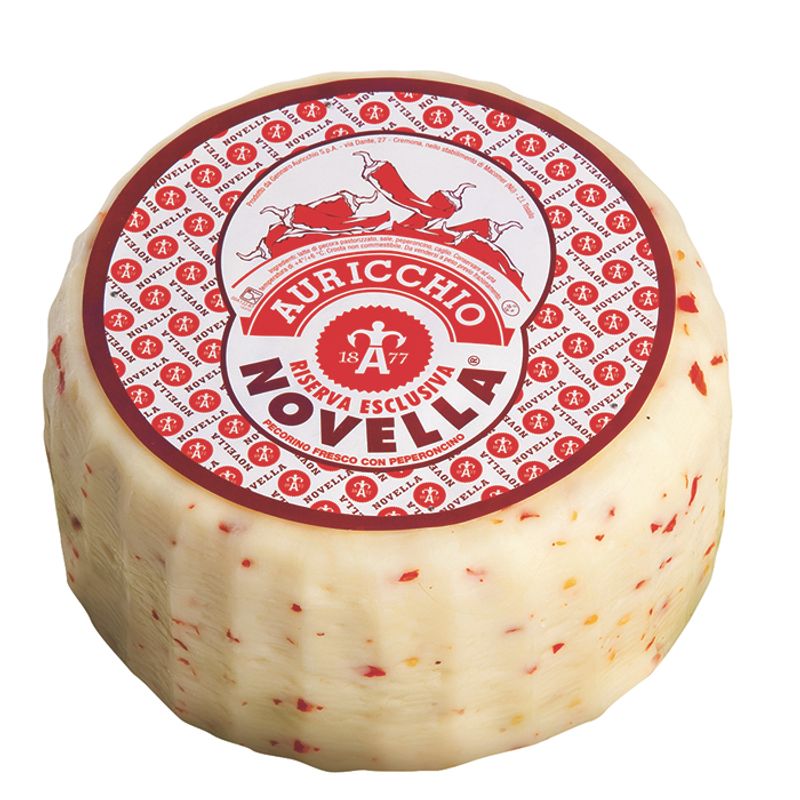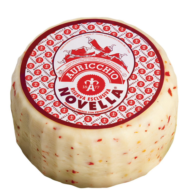 Pecorno Caciotta Novella is made with sheep's milk and dotted with red peppers. Made with sheep’s milk and has an edible rind.