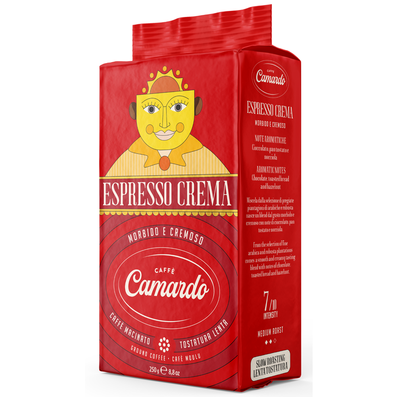 Caffè Camardo carefully selects and blends the best high-quality coffee beans to produce a authentic Italian strong and refined coffee. Camardo Espresso Crema coffee beans are blended with premium Arabica and Robusta coffee beans from India, Central and South America for that long-lasting crema.