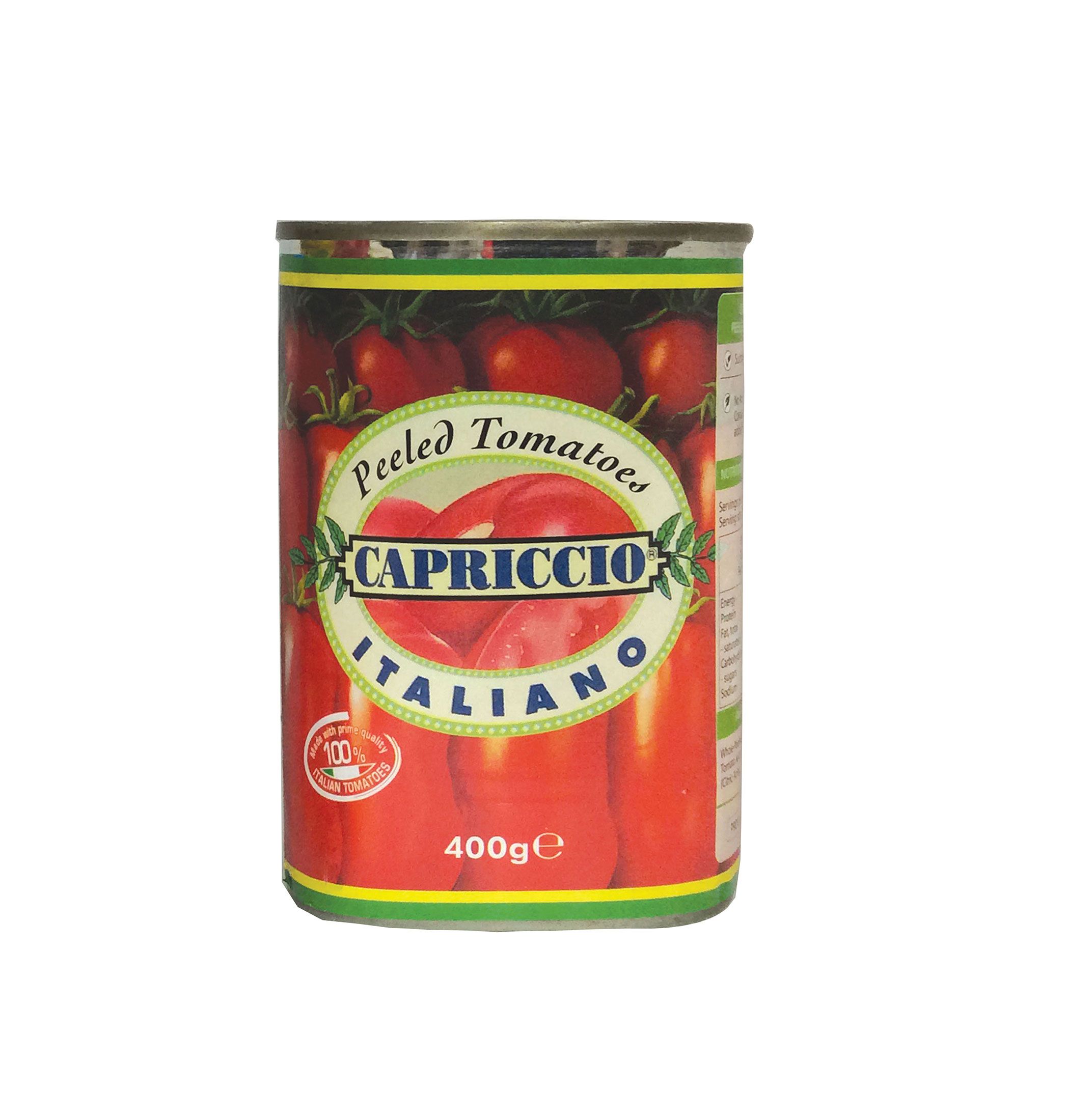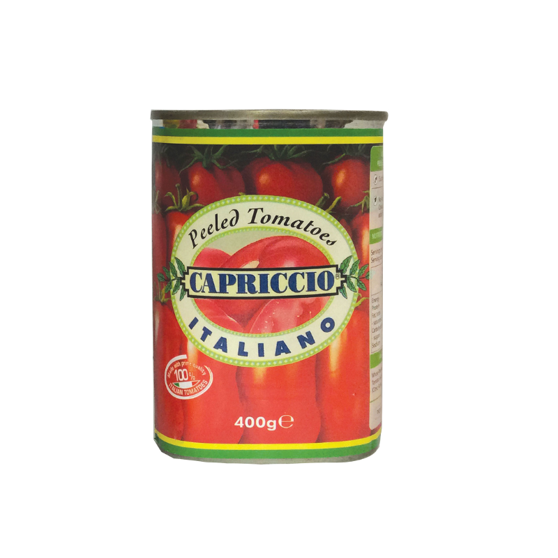 Capriccio Canned Peeled Tomatoes are 100% Italian tomatoes grown on sun-drenched Italian vines and only the plumpest, ripest, juiciest tomatoes with just the right colour intensity, texture and depth of flavour are selected.