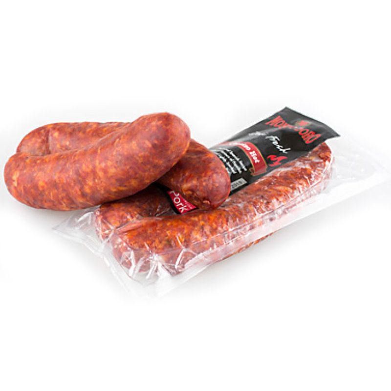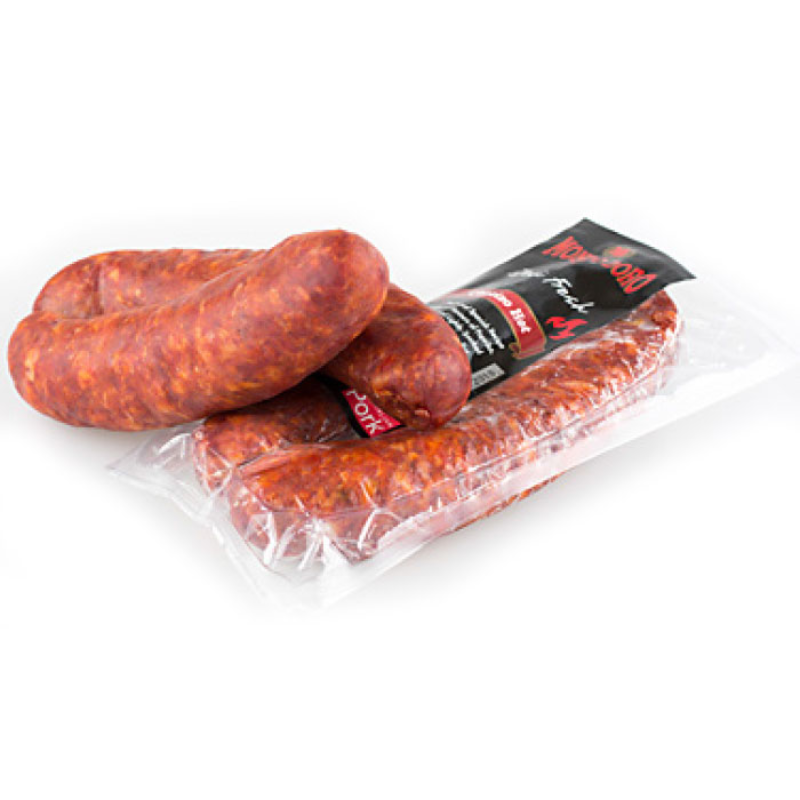 Chorizo hot (spicy) is made from beef & pork then seasoned with paprika and spices with a hint of chilli, following a traditional Spanish recipe. It is a dry-cured pork sausage with a salty, smoky, slightly sweet flavour.