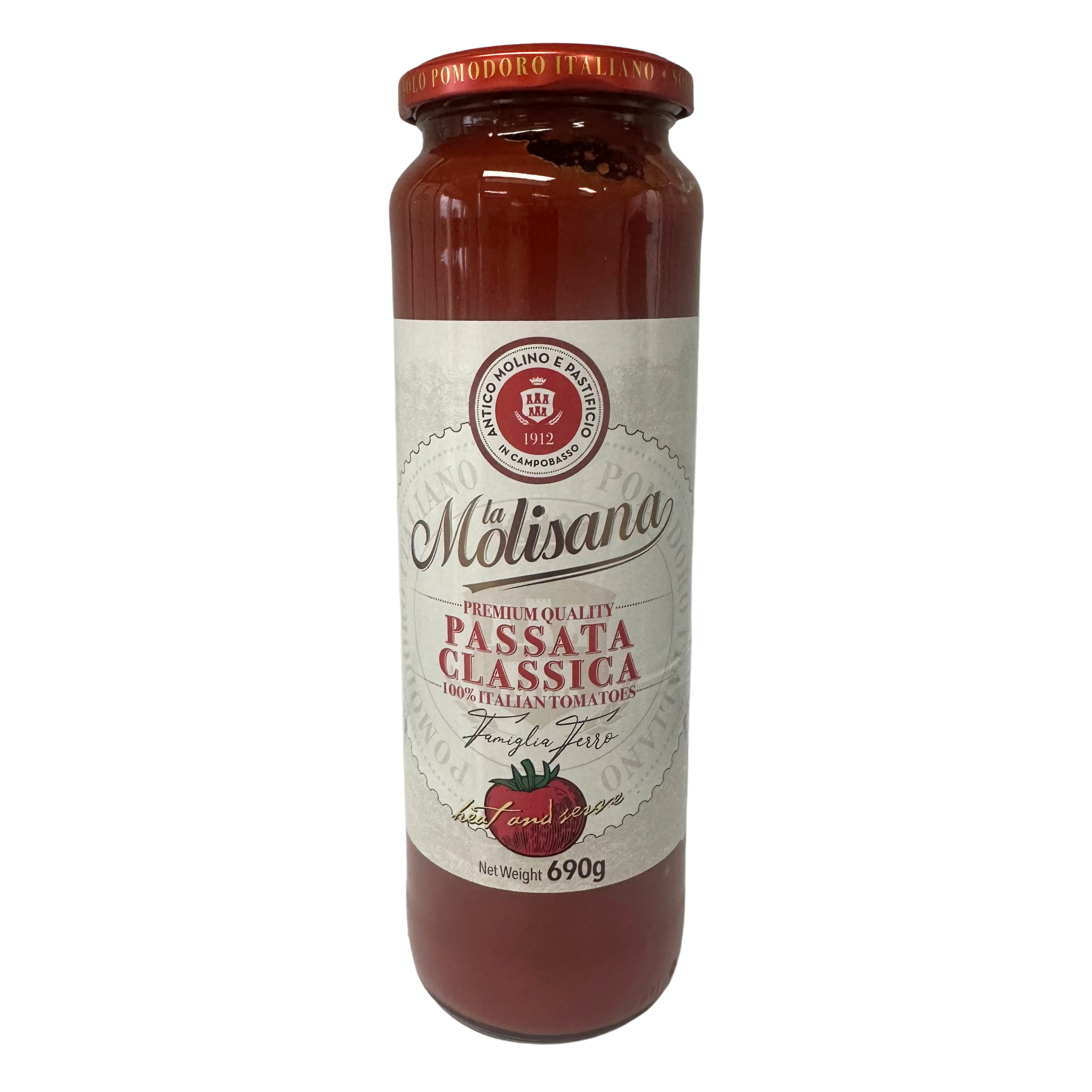 La Molisana Passata Classica Tomato Sauce. Made with 100% Italian tomatoes grown in Puglia, harvested and processed on the same day to preserve the freshness of just picked tomatoes.