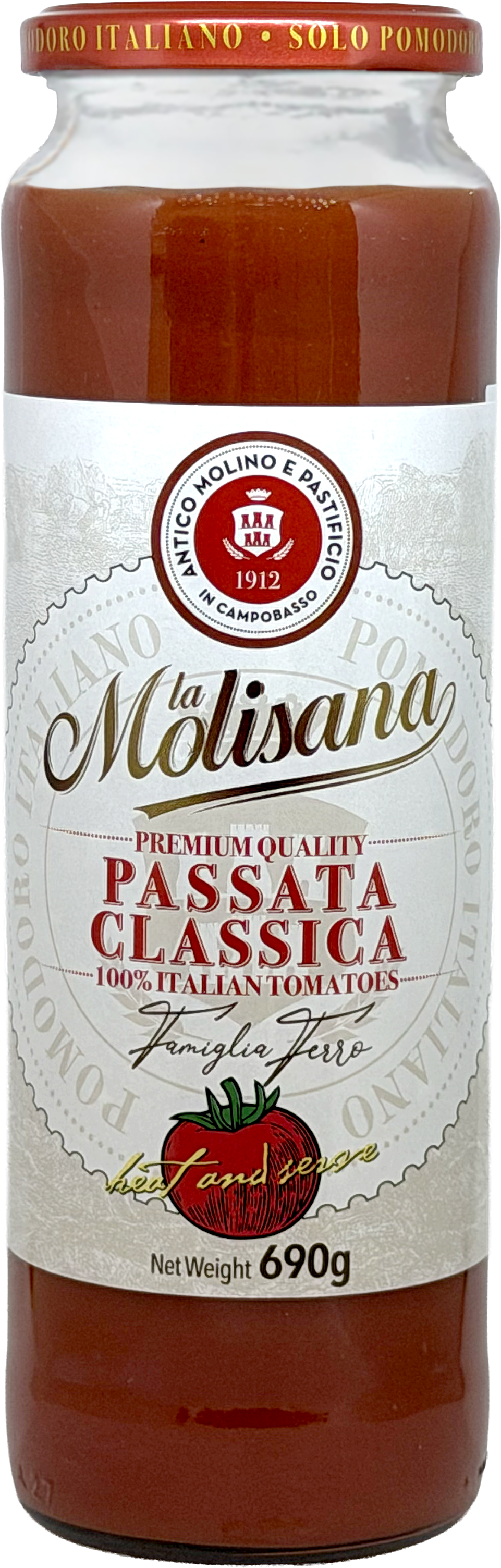 La Molisana Passata Classica Tomato Sauce. Made with 100% Italian tomatoes grown in Puglia, harvested and processed on the same day to preserve the freshness of just picked tomatoes.