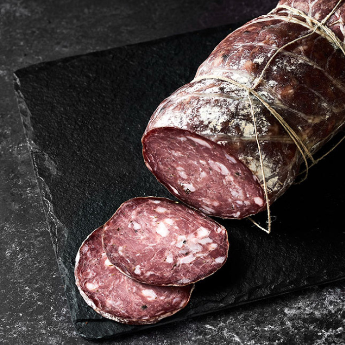 Vicentina Sopressa is a large sized salami, 100mm in diameter. Originates from Veneto, in northern Italy. It’s a coarse minced pork meat and flavoured with white wine, rosemary, garlic and other secret herbs and spices. Air dried for a minimum of three months. It also has a sweet aroma and taste.