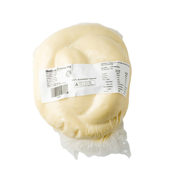 Mexican Cheese (Oaxaca) is a fresh, traditional Mexican-style cheese made from cow's milk. It is mild and creamy and has a salty-sour tang. Mexican cheese comes wrapped up like a all of string and is ideal for melting into a cheesy dip or in quesadillas.