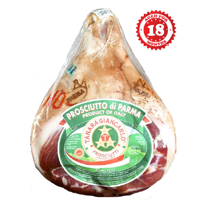 Each ham is fire branded with the four-pointed Parma Crown, certifying it as authentic Prosciutto di Parma.