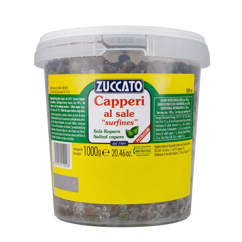 Available in three sizes – Zuccato Capers in Vinegar are 9/10mm in diameter, Zuccato Small Capers are 7mm in diameter and then the Zuccato Baby Capers or smaller again and are only 4mm in diameter