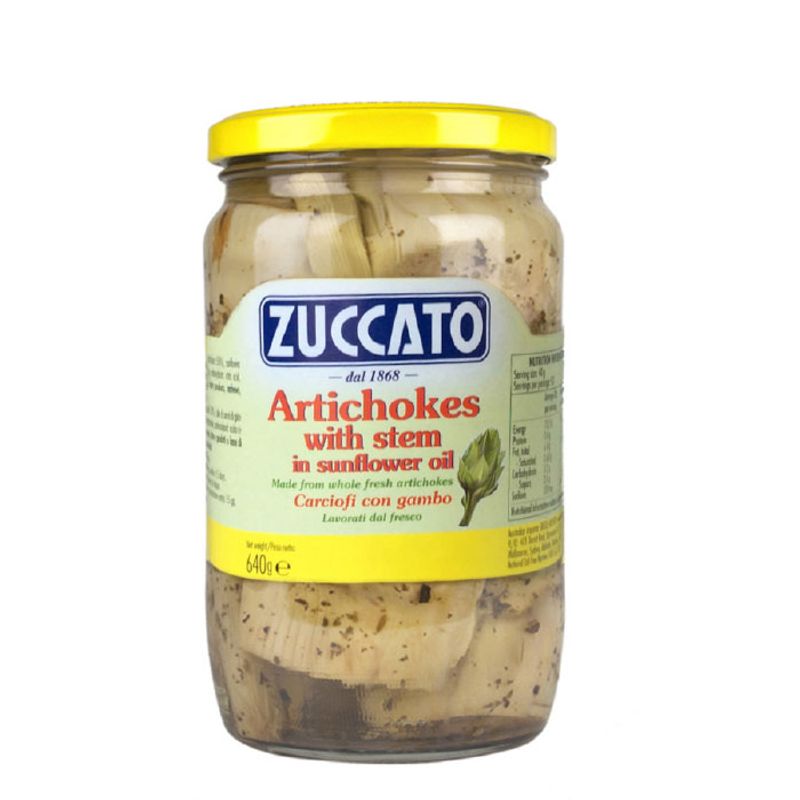 Zuccato Artichokes with stem are super healthy and equally delicious. Marinated in fine sunflower oil and Italian herbs.